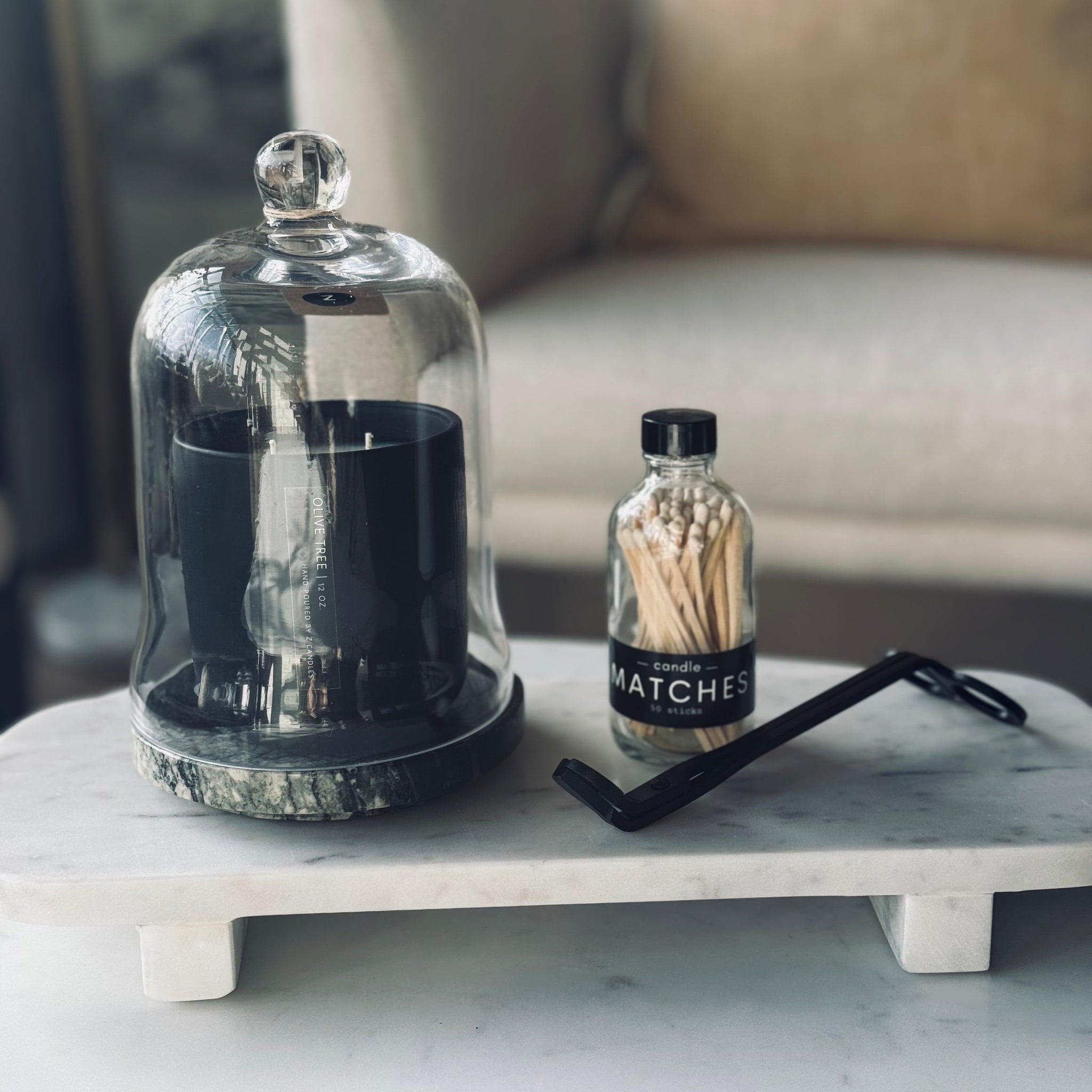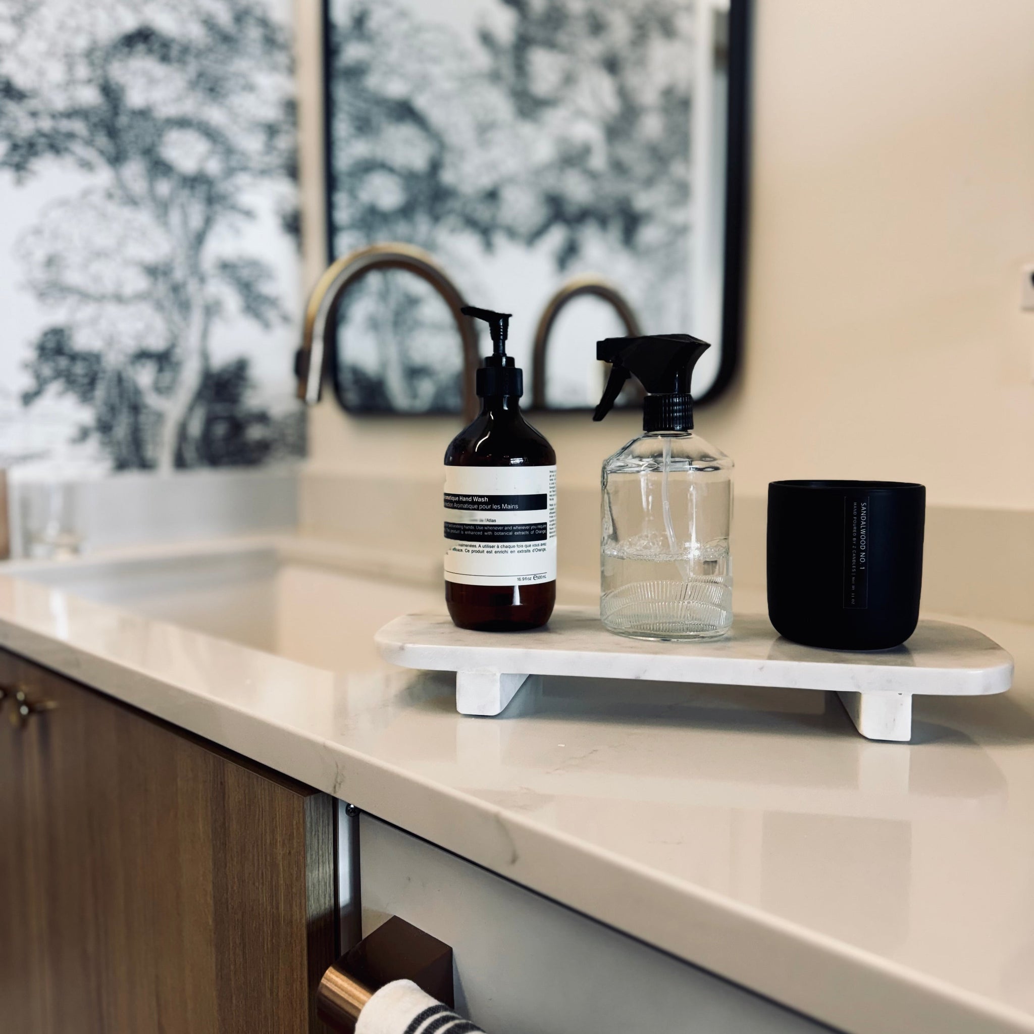 This white marble footed pedestal is the epitome of elegance and functionality. We picture this at your kitchen sink with your pump soap and candle displayed organized and elegant.